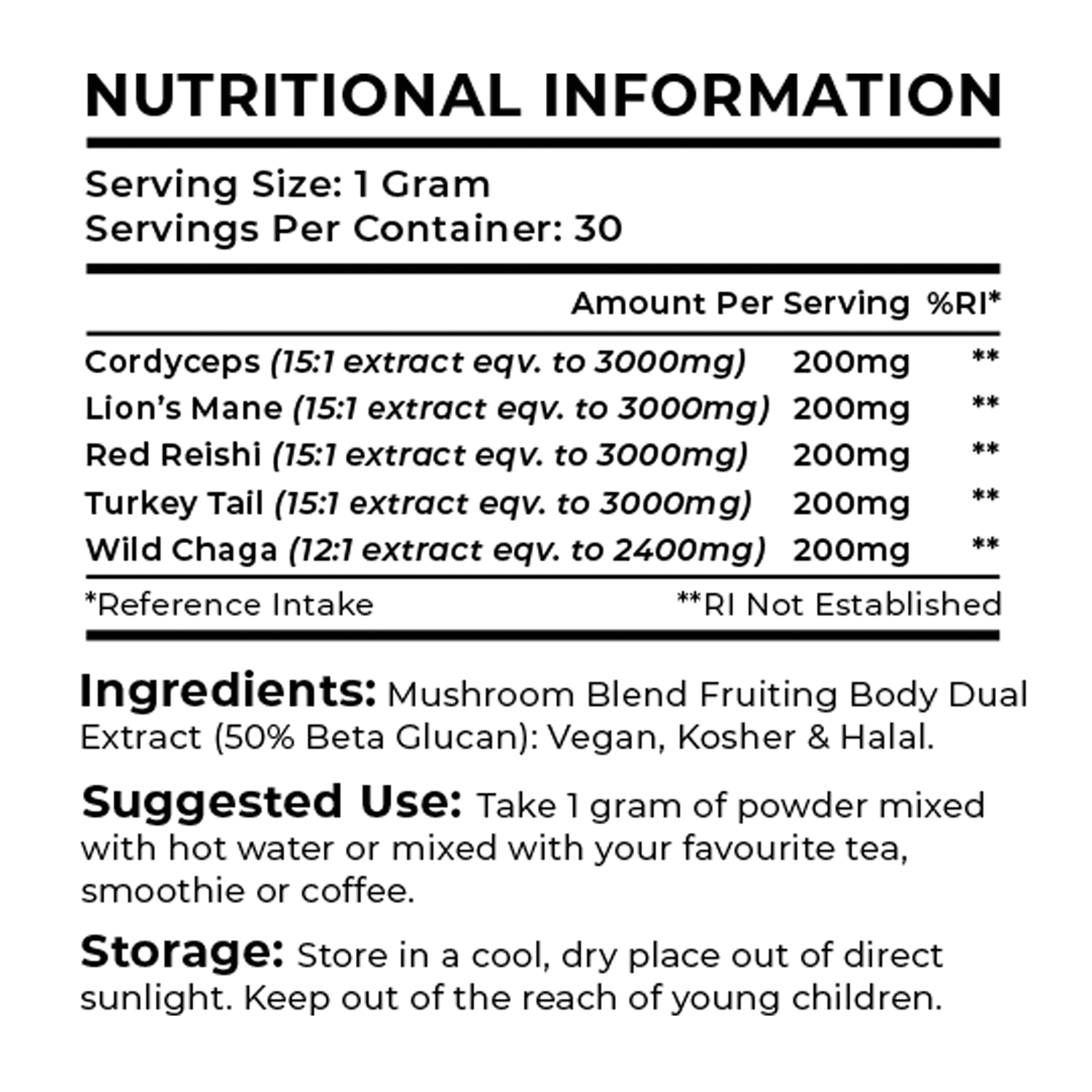 This formula features extracts of Lion's Mane, Cordyceps, Reishi, Chaga and Turkey Tail mushrooms, each working in synergy with the other to support holistic wellbeing.