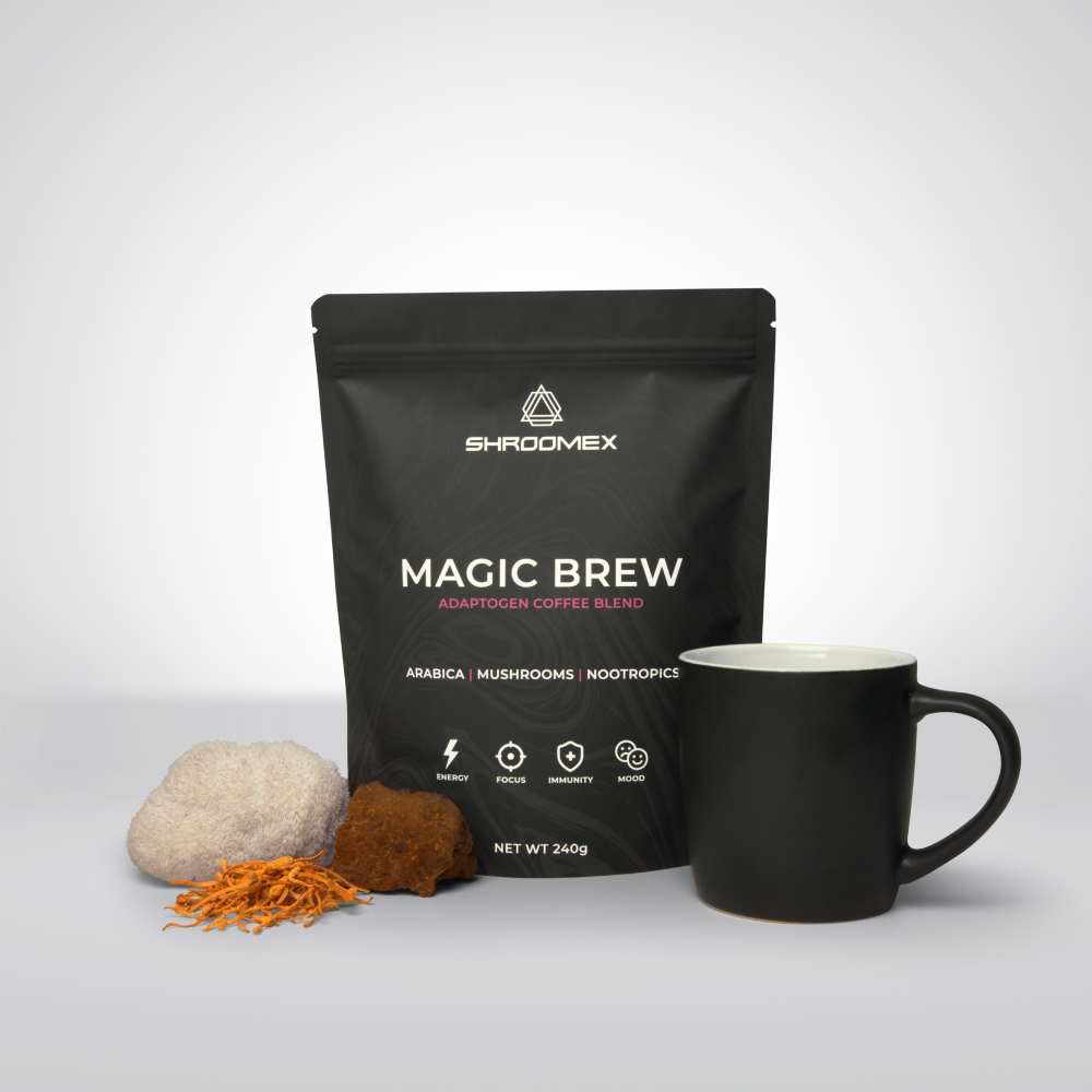 Magic Brew is a high-performance coffee blend made with Colombian Arabica plus 6 functional mushroom & adaptogen extracts: Lion’s Mane, Cordyceps, Chaga, Rhodiola, Ashwagandha and Ginseng.